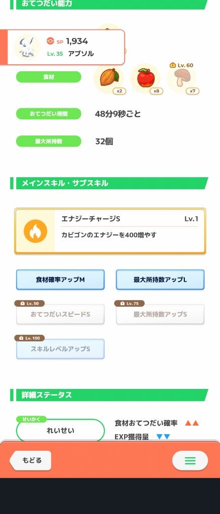 食材Mと所持数MLのリンゴカイロスいるからアブソルはカカオ派